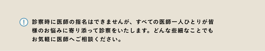 診察ではちょっとしたことでも、何でも質問してくださいね。一つ一つのお悩みに寄り添った回答をさせていただきます。
