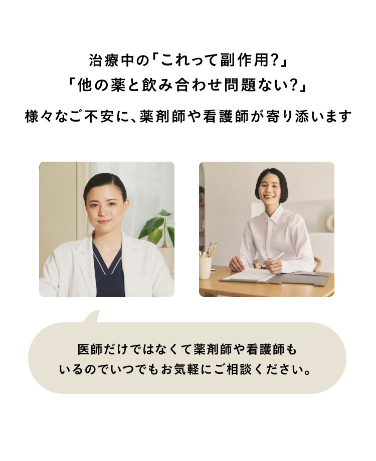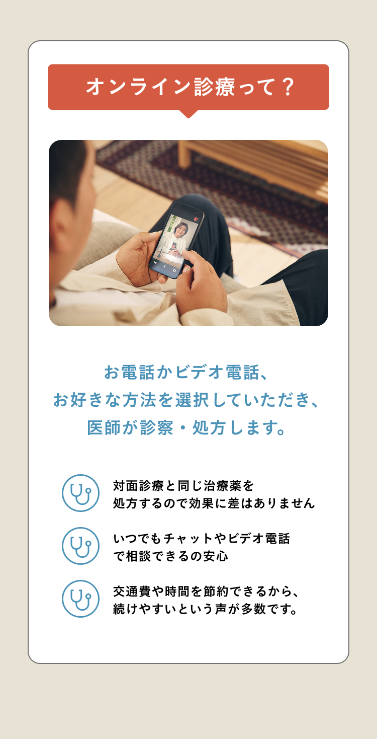 様々な理由で通院が難しい方にとって、オンライン診療は良い味方です。お悩みや診察での疑問点は気兼ねなく伝えてください。