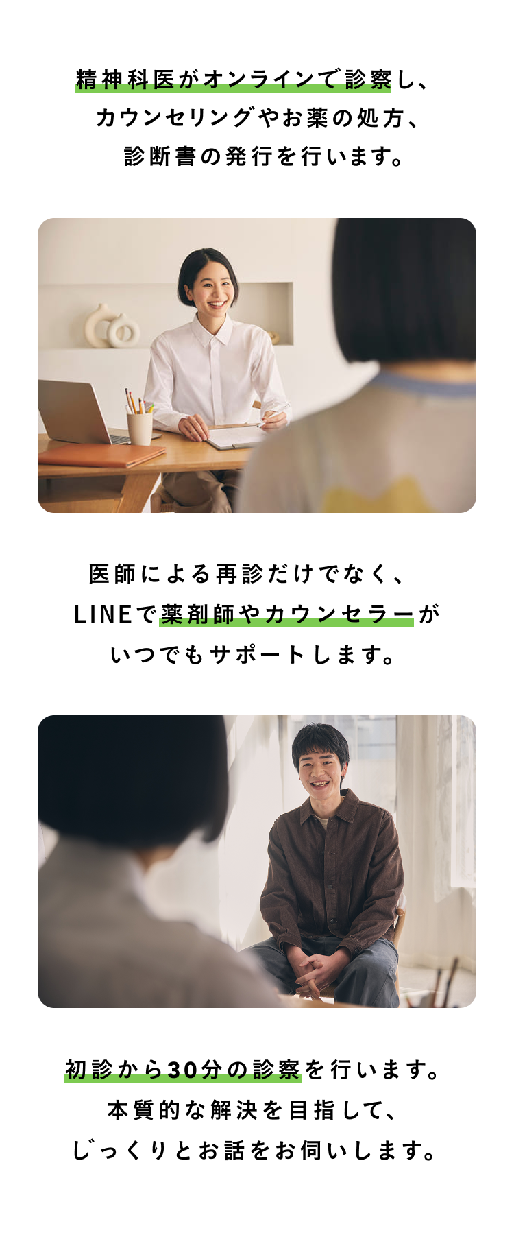 医師との対話を通して、悩みや原因を明らかにした上で根本改善に向けたプランを作成するので、心の変化の見通しを立てることができます。