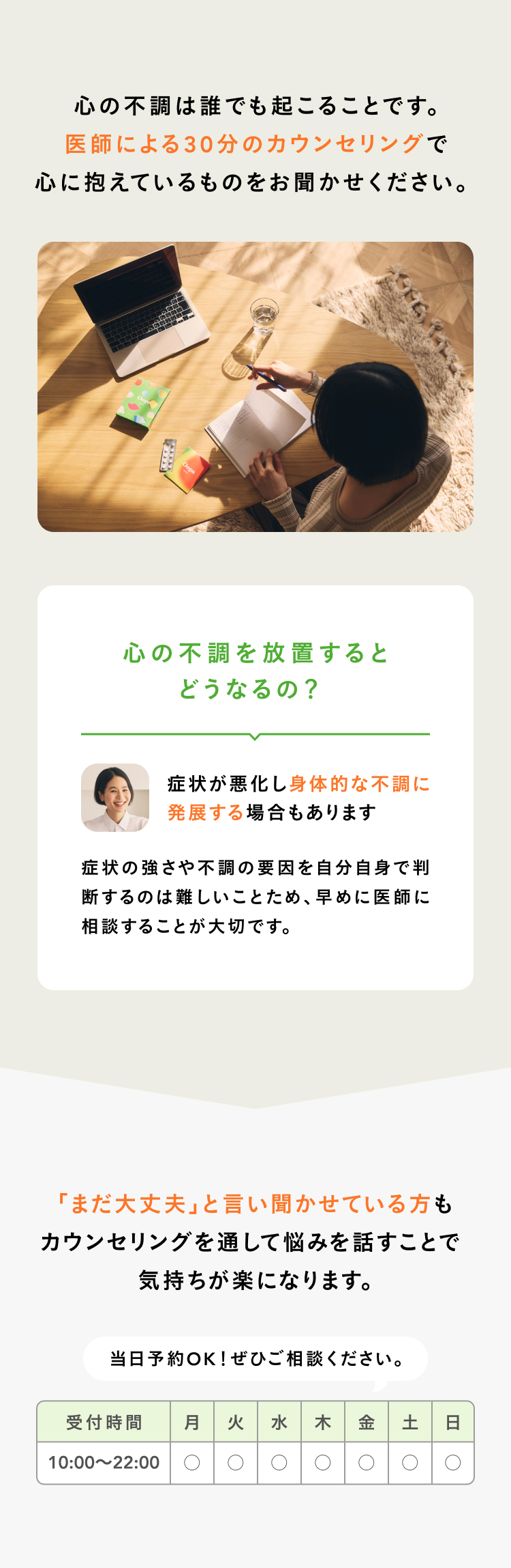 少しでもつらいと感じたら、お気軽にご相談ください。早めに相談いただくことで、症状が悪化する前に適切な対処ができ、改善に向かいやすくなります。